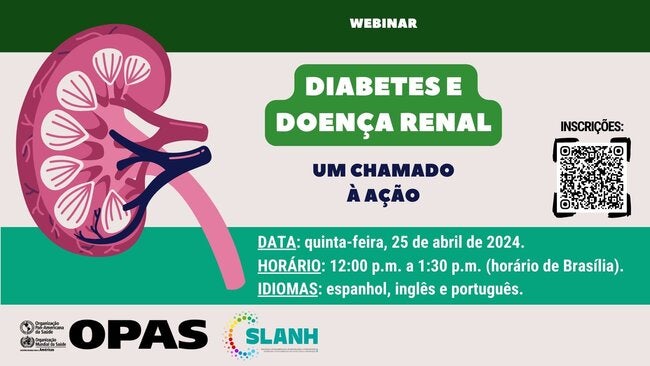 Junte-se a nós na quinta-feira, 25 de abril de 2024, às 11h. (Washington D.C. ou EDT- 12 h Brasília-BR) para o webinar Diabetes e Doença renal: um apelo à ação. O evento tem como objetivo contribuir para o conhecimento da doença renal atribuída à diabetes e salientar a importância e os recursos técnicos disponíveis para a sua prevenção, diagnóstico precoce e tratamento oportuno.