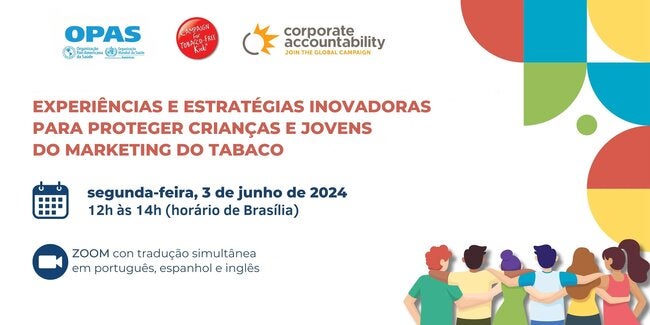 Junte-se a nós na segunda-feira, 3 de junho de 2024, às 12h (horário de Brasília) para o webinar Experiências e Estratégias Inovadoras para Proteger Crianças e Jovens do Marketing do Tabaco, co-organizado pela Organização Pan-Americana da Saúde, Campaign for Tobacco-Free Kids e Corporate Accountability. Esse evento será realizado em comemoração ao Dia Mundial sem Tabaco de 2024 (31 de maio), que este ano tem como objetivo fornecer uma plataforma para que os jovens exijam que a indústria do tabaco pare de direcioná-los a produtos prejudiciais à saúde.