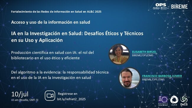 Na quinta-feira, 10 de julho de 2025, às 11h (hora de Brasília, GMT-3), a BIREME realizará o webinário “IA na pesquisa em saúde: desafios éticos e técnicos em seu uso e aplicação”, no contexto do eixo Acesso e uso da informação em saúde. Esta iniciativa faz parte do programa de cooperação técnica para o fortalecimento das Redes de Informação em Saúde na América Latina e Caribe.