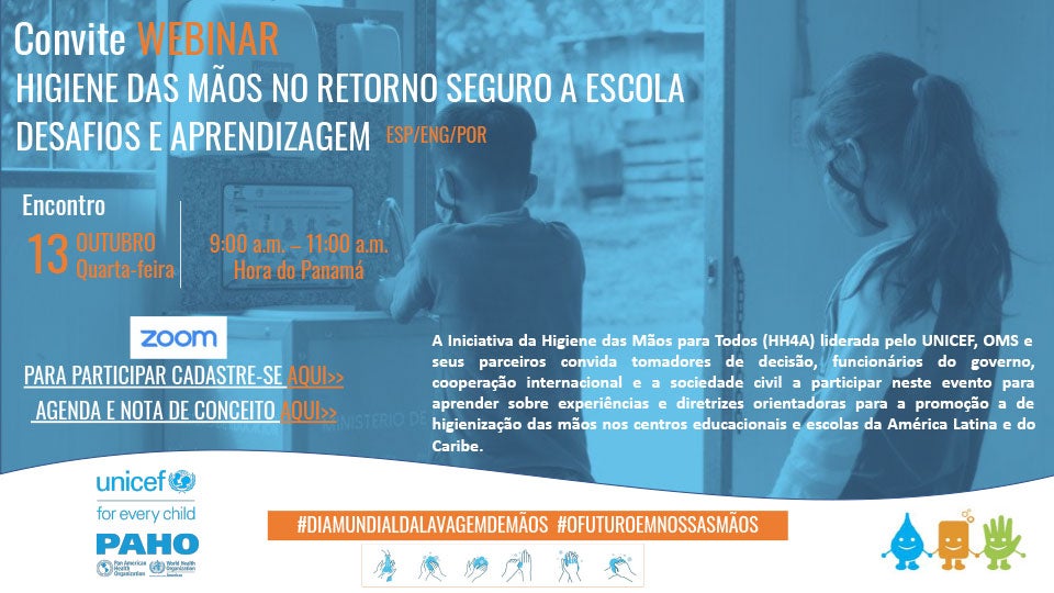 A Iniciativa da Higiene das Mãos para Todos (HH4A) liderada pelo UNICEF, OMS e seus parceiros convida tomadores de decisão, funcionários do governo, cooperação internacional e a sociedade civil a participar neste evento para aprender sobre experiências e diretrizes orientadoras para a promoção a de higienização das mãos nos centros educacionais e escolas da América Latina e do Caribe.