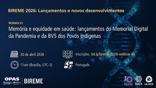 Na quinta-feira, 30 de abril de 2026, às 11h (Brasília, UTC-3), a BIREME/OPAS/OMS realizará a sessão “Memória e equidade em saúde: lançamentos do Memorial Digital da Pandemia e da BVS dos Povos Indígenas”, como parte do programa “BIREME 2026 de lançamentos e novos desenvolvimentos”.