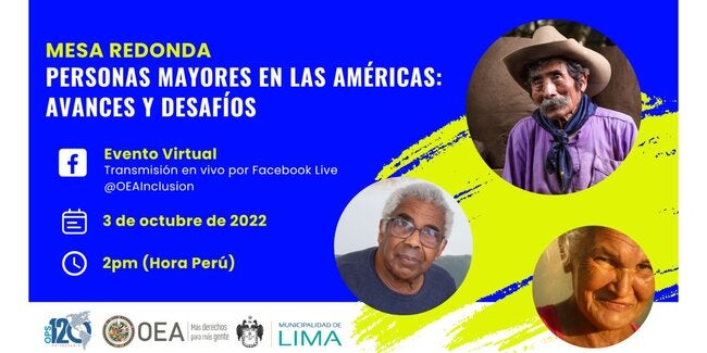 A Unidade de Saúde Curso de Vida Saudável da Organização Pan-Americana da Saúde (OPAS), o Departamento de Inclusão Social da Secretaria de Acesso a Direitos e Equidade da OEA,e o Município Metropolitano de Lima organizam a Mesa Redonda "Pessoas Idosas nas Américas: Avanços e Desafios" a ser realizada na segunda-feira, 3 de outubro de 2022.