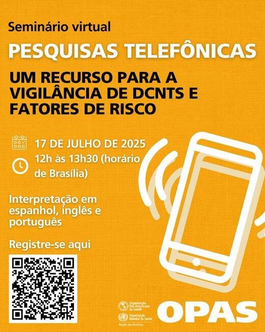 Junte-se a nós na quinta-feira, 17 de julho de 2025, às 11h (EDT) no seminário virtual Pesquisas telefônicas: um recurso para a vigilância de DCNTs e fatores de risco, para discutir como as pesquisas telefônicas podem oferecer uma abordagem escalável e adaptável para gerar dados oportunos e relevantes para políticas públicas, impulsionando ações efetivas de saúde pública em toda a Região das Américas. can offer a scalable and adaptable approach to generating timely, policy-relevant NCD and risk factors data that can drive effective public health action across the Americas. O seminário virtual é organizado pela Unidade de Prevenção de Doenças Não Transmissíveis, Violência e Lesões do Departamento de Doenças Não Transmissíveis e Saúde Mental da OPAS.