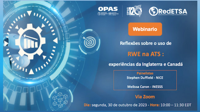 A Organização Pan-Americana da Saúde e a Rede de Avaliação de Tecnologias em Saúde das Américas (RedETSA) convidam para uma nova edição do Programa Webinar da RedETSA: Reflexōes sobre o uso de RWE na ATS: experiências da Inglaterra e Canadá, a ser realizada na segunda-feira, 30 de outubro, das 10h00 às 11h30 (EDT/WDC).