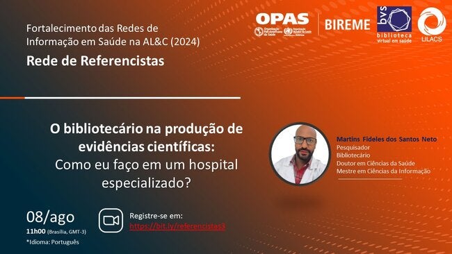 Junte-se a nós na quinta-feira, 08 de agosto de 2024, às 11:00 (Brasília, GMT-3) para o webinário "O bibliotecário na produção de evidências científicas: Como faço isso em um hospital especializado?". Este é o terceiro de uma série de três encontros organizados pela BIREME para a Rede de Referencistas (RefNet) e outros interessados.