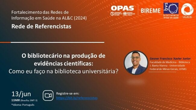 Junte-se a nós no dia 13 de junho de 2024 às 11:00 a.m. (Brasília, GMT-3) para o webinário O bibliotecário na produção de evidências científicas: Como eu faço na biblioteca universitária?. Este seminário virtual é o primeiro de uma série de três encontros organizados pela BIREME para a Rede de Referencistas (RefNet) e outros interessados no tema.