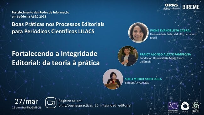Na quinta-feira, 27 de março de 2025, às 12h00 (Brasília, GMT-3), a BIREME realizará o webinário “Fortalecimento da Integridade Editorial: da teoria à prática”, que marcará o início da série “Boas práticas nos processos editoriais dos periódicos LILACS”. Essa iniciativa faz parte do programa de cooperação técnica para o fortalecimento das Redes de Informação em Saúde na América Latina e Caribe.