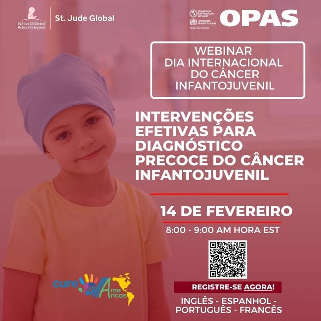 Junte-se a nós na sexta-feira, 14 de fevereiro de 2025, às 8h (horário de Washington DC) no webinar "Intervenções efetivas para diagnóstico precoce do câncer infantojuvenil", organizado em conjunto pelo St. Jude Children's Research Hospital e pela Organização Pan-Americana da Saúde, para marcar o Dia Internacional do Câncer Infantil de 2025. Este evento destacará os avanços na região relacionados ao diagnóstico oportuno do câncer infantil como parte dos esforços contínuos no âmbito da Iniciativa Global da OMS para o Câncer Infantil.