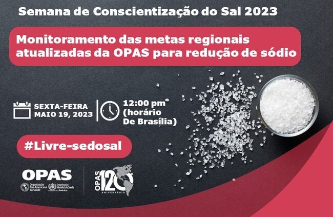 Junte-se a nós na sexta-feira, 19 de maio, no webinar "Monitoramento das metas regionais atualizadas da OPAS para redução de sódio" como parte das atividades da Semana de Conscientização sobre o Sal 2023 (15 a 21 de maio) #Livre-sedosal. O evento será transmitido via Zoom das 12h às 14h (horário de Washington DC) e terá tradução simultânea em inglês, espanhol e português.