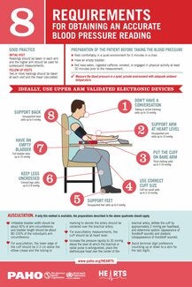 To obtain an accurate measurement of blood pressure, it is necessary to adopt a series of procedures that include the preparation of the patient before taking blood pressure, technique used by the health worker, selection of a quiet space, and use of an accurate blood pressure monitor. Good practice includes taking measurements on both arms at the initial visit, and then continuing to use the arm with the highest measurement. At follow-up visits, two or more readings should be taken at each visit and the mean calculated.