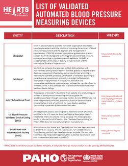 HEARTS in the Americas has identified that the issue of accuracy of blood pressure measurement is key to ensuring the advancement of the initiative as it is a crucial factor for the correct diagnosis and management of hypertension. Measuring blood pressure with non-validated equipment is a serious problem of quality of health services and a matter of patient safety. Therefore, it is working with countries on the use of correct measurement protocols, validation of automated blood pressure measuring devices, and strengthening regulatory frameworks to guarantee the exclusive use of validated devices.
