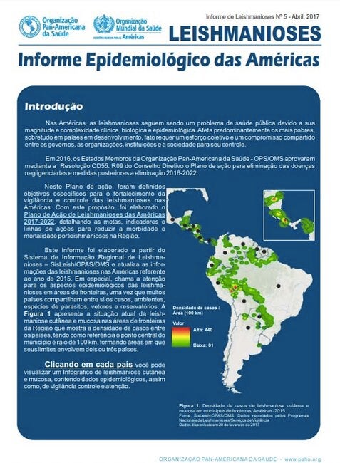 Nas Américas, as leishmanioses seguem sendo um problema de saúde pública devido a sua magnitude e complexidade clínica, biológica e epidemiológica. Afeta predominantemente os mais pobres, sobretudo em países em desenvolvimento, fato requer um esforço coletivo e um compromisso compartido entre os governos, as organizações, instituições e a sociedade para seu controle... Este Informe foi elaborado a partir do Sistema de Informação Regional de Leishmanioses – SisLeish/OPAS/OMS e atualiza as informações das leishmanioses nas Américas referente ao ano de 2015.