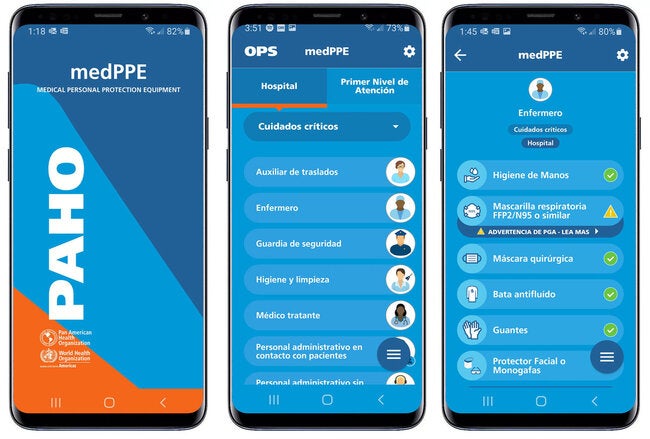 medPPE é um aplicativo para dispositivos iOS e Android em que o trabalhador de saúde encontrará as informações necessárias sobre equipamentos de proteção individual (EPI) sugeridos pela OPAS/OMS, que devem ser utilizadas de acordo com o papel e atividade que desempenha no cuidado de pacientes com doenças, como a COVID-19, transmitidas por gotas e contato, ou durante procedimentos de geração de aerossóis (PGA).
