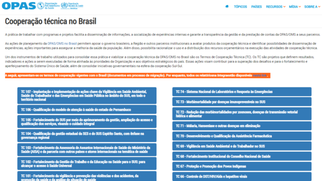 A Organização Pan-Americana da Saúde/Organização Mundial da Saúde (OPAS/OMS) atua nos países da Região por meio de programas e projetos de cooperação técnica que formalizam e operacionalizam a disseminação de informação, compartilhamento de experiências e garantem a transparência e controle da gestão de recursos e prestação de contas entre todos os envolvidos. Os Termos de Cooperação (TC) estão entre os instrumentos mais utilizados pela Organização para consolidar esta prática, além de Convênios e Contratos alinhados as políticas e processos Organizacionais.
