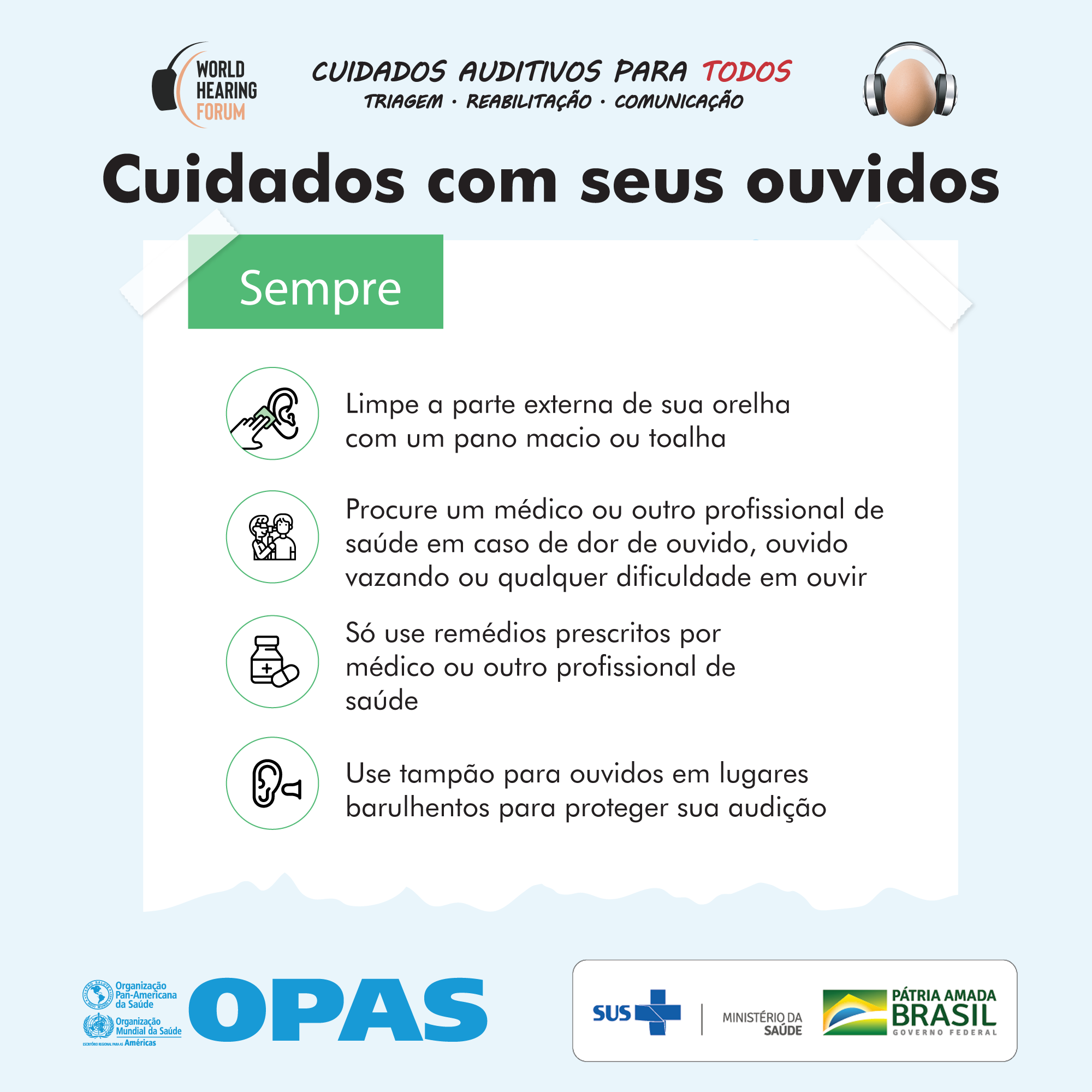 Para Maíra Botelho, diretora de Atenção Especializada e Temática (DAET/SAES) do Ministério da Saúde do Brasil, a motivação é promover a melhoria da qualidade de vida de quem precisa. “Para muitos de nós, é fácil esquecer da importância dos sentidos no nosso dia a dia. O SUS sabe dessa importância e acolhe os brasileiros que precisam de apoio para viver melhor e fazemos isso com compreensão e capacidade de atendimento. Além das ações de prevenção sobre problemas auditivos, o SUS oferece diagnóstico, concessão de dispositivos auditivos, manutenção de próteses auditivas e terapias fonoaudiológicas.”