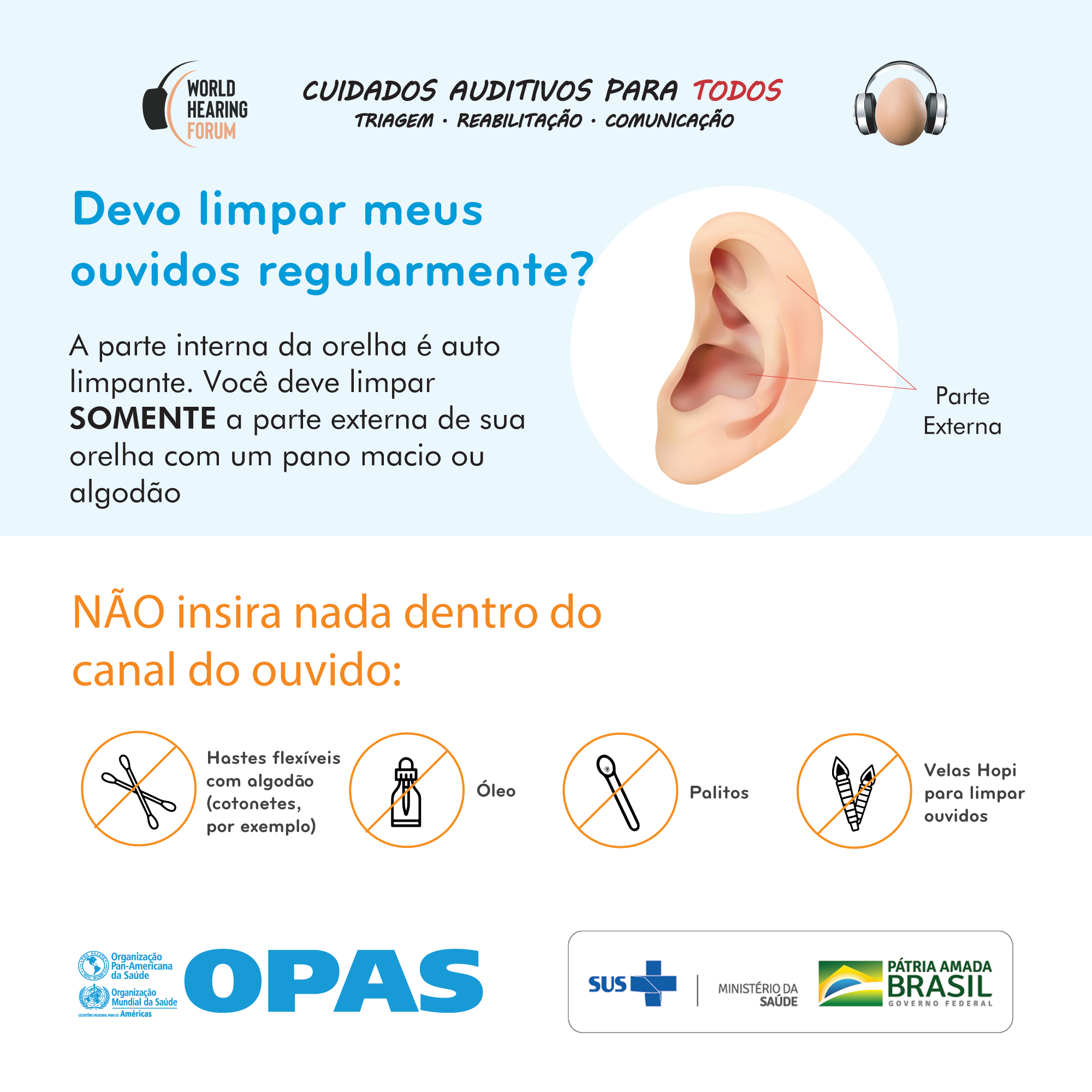 Com o slogan "Cuidados auditivos para todos. Triagem. Reabilitação. Comunicação", a campanha que marca a celebração do Dia Mundial da Audição deste ano no Brasil é promovida em parceria com o Ministério da Saúde e as seguintes instituições parceiras: Academia Brasileira de Audiologia (ABA); Sociedade Brasileira de Fonoaudiologia (SBFa); Associação Brasileira de Otorrinolaringologia e Cirurgia Cérvico-Facial (ABORL CCF); Sociedade Brasileira de Otologia (SOB); Conselho Federal de Fonoaudiologia (CFFa); e Comitê Multiprofissional de Saúde Auditiva (COMUSA).