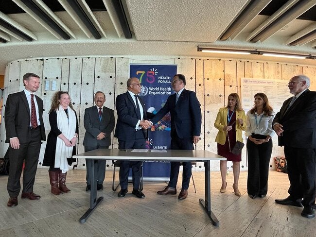 Brasília, 23 de maio de 2023 – A Fundação Oswaldo Cruz (Fiocruz) e a Organização Mundial da Saúde (OMS) firmaram nesta segunda-feira (22/05), durante a Assembleia Mundial da Saúde, em Genebra, na Suíça, uma parceria para fortalecer a vigilância global de vírus, bactérias e outros patógenos causadores de doenças.