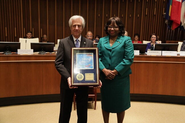 “É uma honra conceder essa distinção especial a alguém que, além de ter vocação como médico, tem sido um grande defensor da saúde pública por sua visão estratégica única dentro do cenário político”, disse Carissa F. Etienne, diretora da OPAS, durante a cerimônia de premiação na sede do organismo internacional em Washington, EUA. As conquistas do presidente Vázquez “refletem um profundo compromisso para melhorar a vida, a saúde e o bem-estar não só dos uruguaios, mas também de tantos outros países das Américas e de outras regiões”, acrescentou.