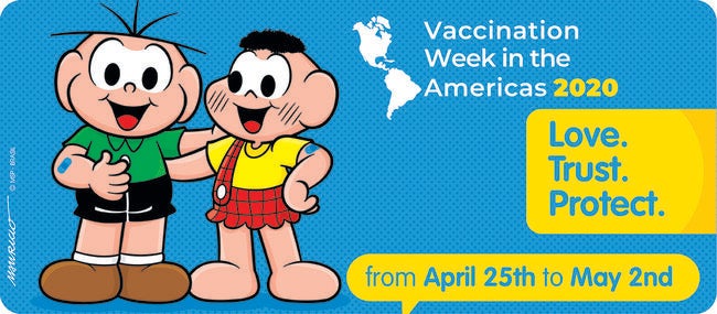 27 de abril de 2020 – As personagens da Turma da Mônica, história em quadrinhos brasileira, estão incentivando as pessoas a se vacinarem durante a 18ª Semana de Vacinação nas Américas, celebrada entre 25 de abril e 2 de maio de 2020 com o slogan “Ame. Confie. Proteja. #VacineSe”. A iniciativa é promovida anualmente pela Organização Pan-Americana da Saúde (OPAS).