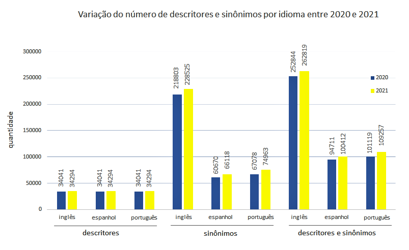 Alguns outros novos descritores relacionados com COVID-19, como Anosmia, Retorno à Escola, Distanciamento Social e Teletrabalho, dentre outros, também foram incluídos, refletindo a magnitude de assuntos em documentos científicos produzidos no contexto da pandemia. Houve um pequeno aumento de 0,74% na quantidade de registros de descritores com relação à edição do ano anterior. Entretanto, a quantidade de sinônimos aumentou mais de 10% em português e espanhol.
