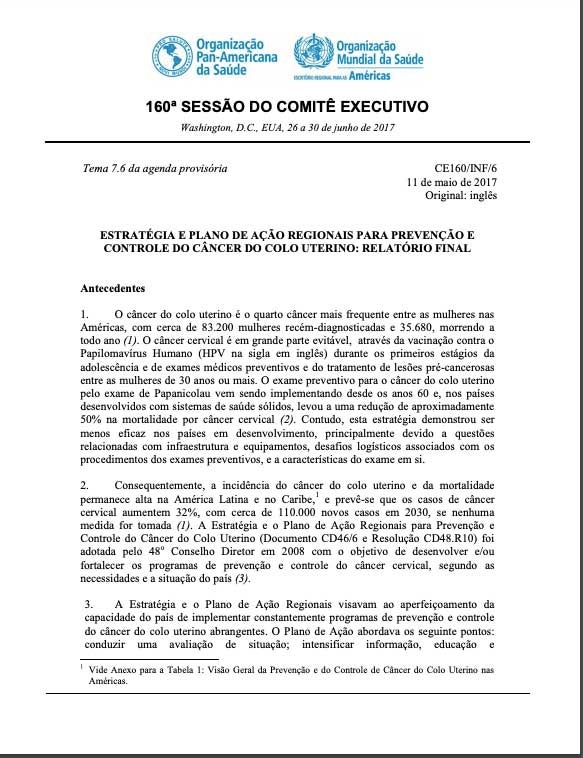 O câncer é a segunda maior causa de morte entre as pessoas adultas na Região das Américas. Nas mulheres, o câncer do colo do útero é a principal causa de morte por câncer em seis países e a segunda principal causa em outros 14 países. A cada ano, são diagnosticados 72.719 casos novos de câncer do colo do útero, e 36.797 mulheres da Região morrem devido a essa doença; uma proporção significativa (52%) das mortes ocorre durante os anos economicamente ativos das mulheres, antes dos 60 anos de idade.